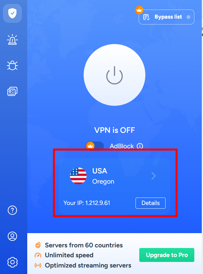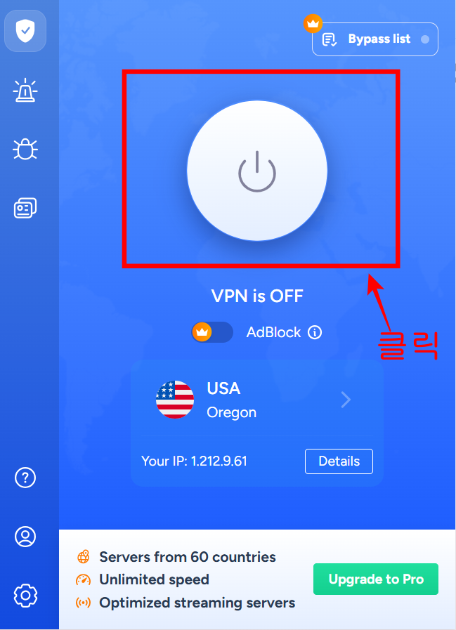 국가 변경을 하고 전원 버튼을 눌러서 VPN을 켭니다. 단, 미국 일부 국가만 유료로 설정할 수 있습니다.