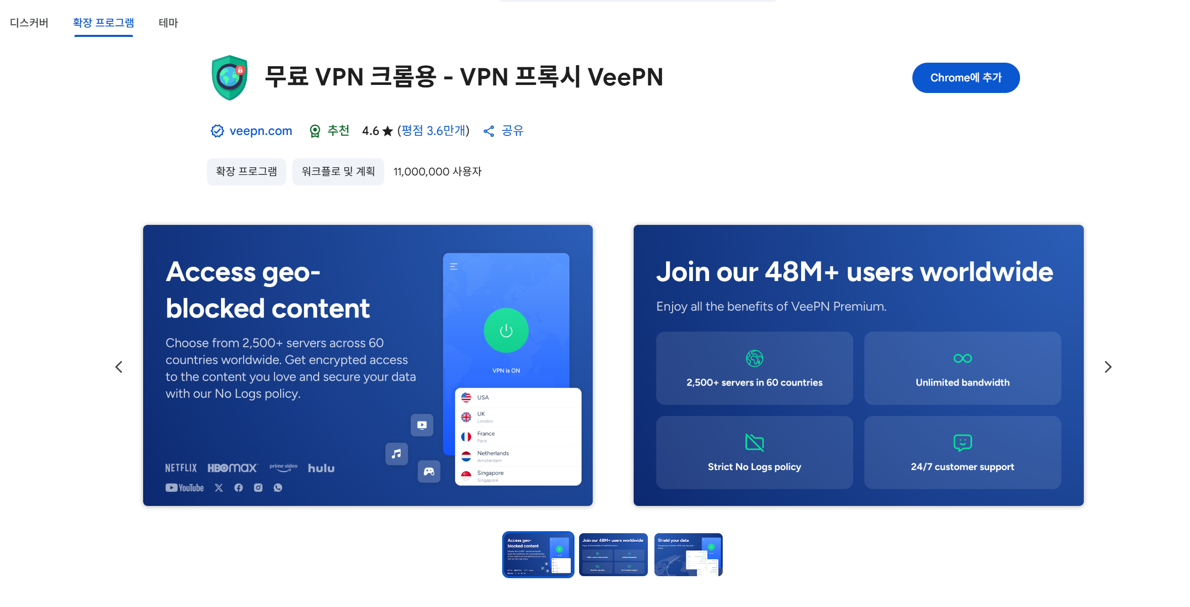 아래 크롬 확장프로그램 추가 링크에서 VeePN을 추가합니다. 링크를 접속해서 'chrome에 추가'를 누르면 됩니다.