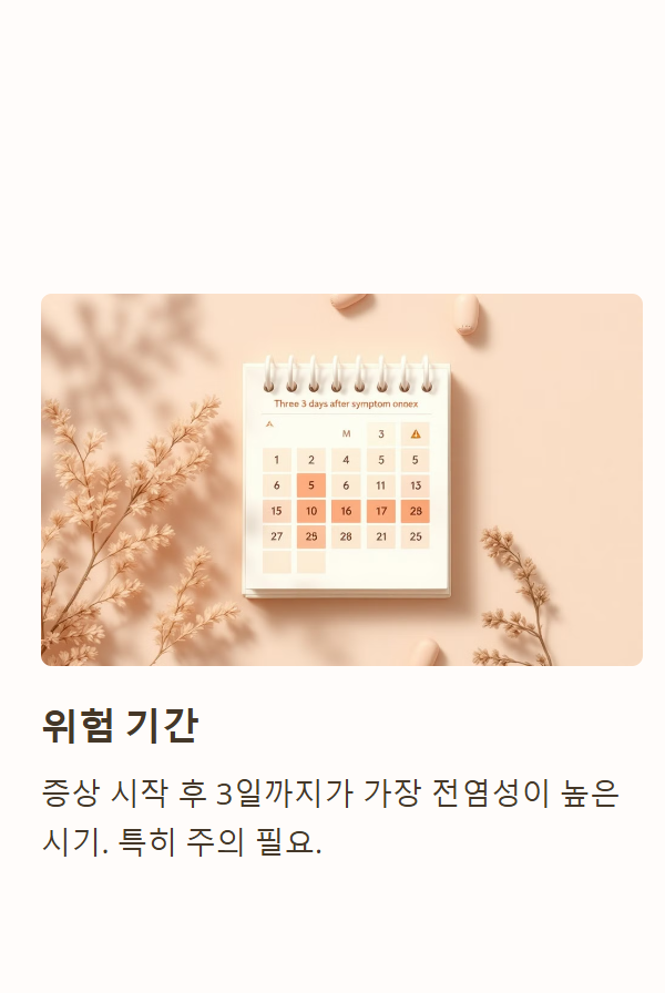 가장 위험한 시기는 증상 시작 후 3일까지인데요. 이 시기에는 절대로 외출하지 말고 가족들과도 접촉을 최소화해야 합니다. 감염력이 가장 강한 시기이기 때문이에요.