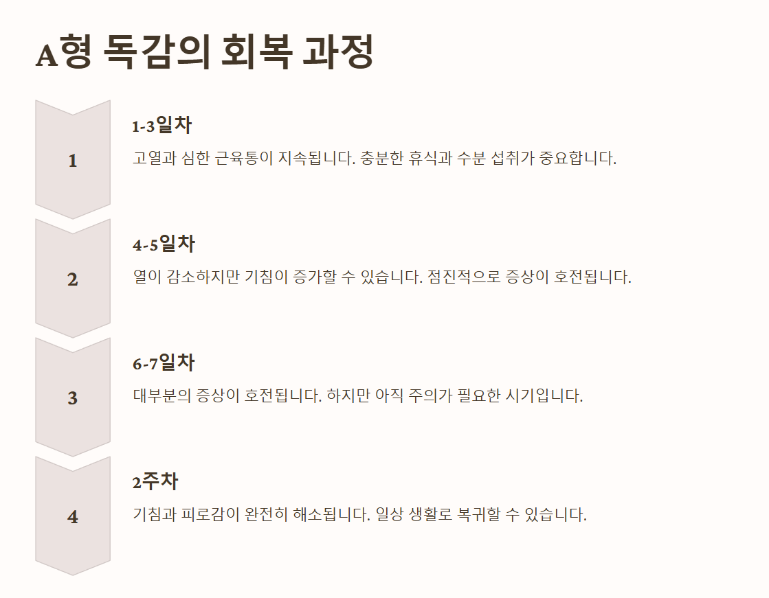 A형 독감은 항바이러스제(타미플루) 복용과 함께 충분한 휴식이 필수입니다. 회복 기간은 사람마다 다른데요, 보통 이렇게 진행됩니다.