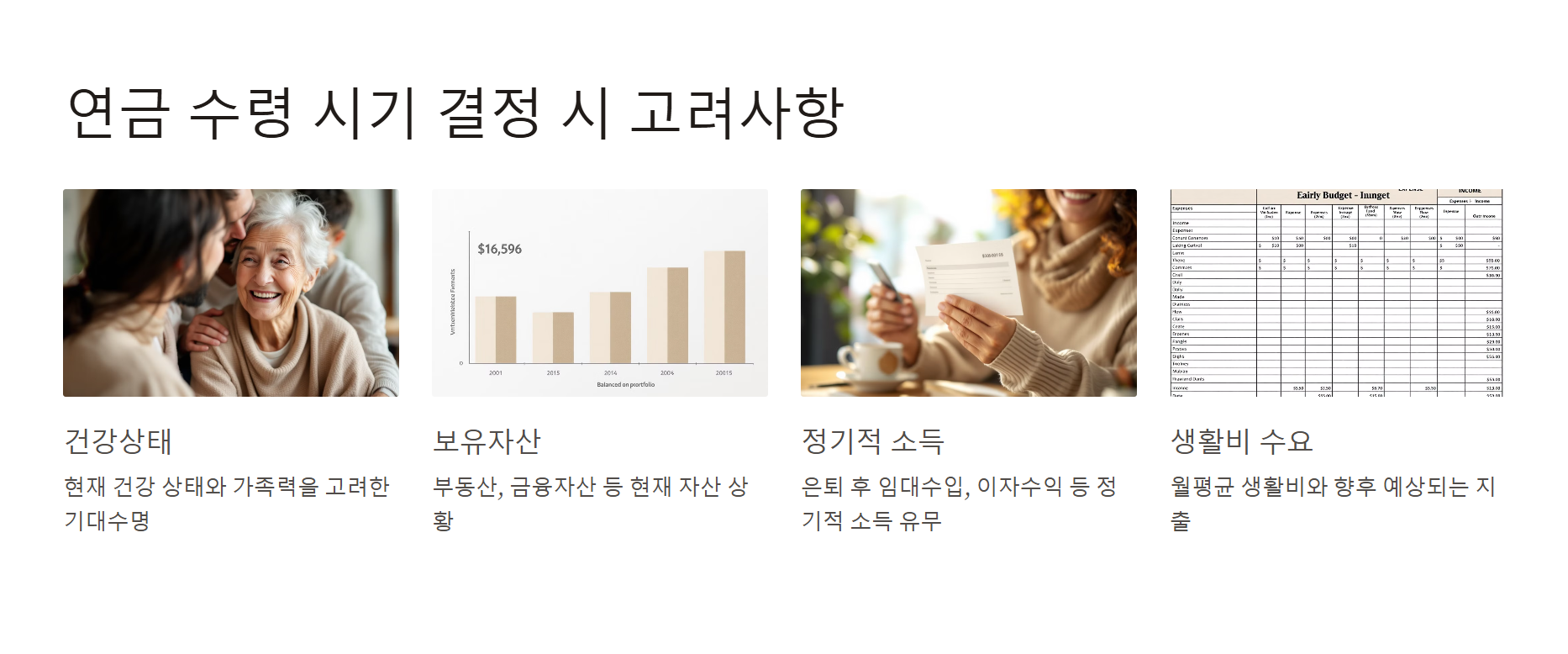 노령연금 수령 시기 결정은 단순히 금액만의 문제가 아닙니다. 본인의 건강상태, 현재 보유자산 상황, 정기적인 소득 유무, 그리고 생활비 수요 등을 종합적으로 고려해야 합니다.