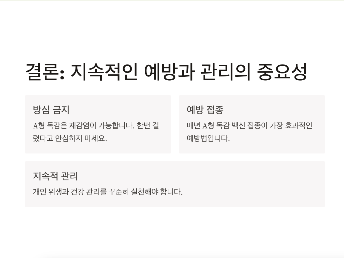 이처럼 A형 독감은 한번 걸리면 다시 안걸리는 것이 아니고, 완벽한 면역이 생기지 않습니다. 한번 걸리면 안걸릴 것이라고 안일한 생각으로 방심하며느 변이된 바이러스에 의해 재감염될 수 있습니다. 따라서 지속적인 예방과 관리가 필요하며, 매년 A형 독감 백신 접종을 통해 예방하는 것이 가장 효과적인 방법입니다.
