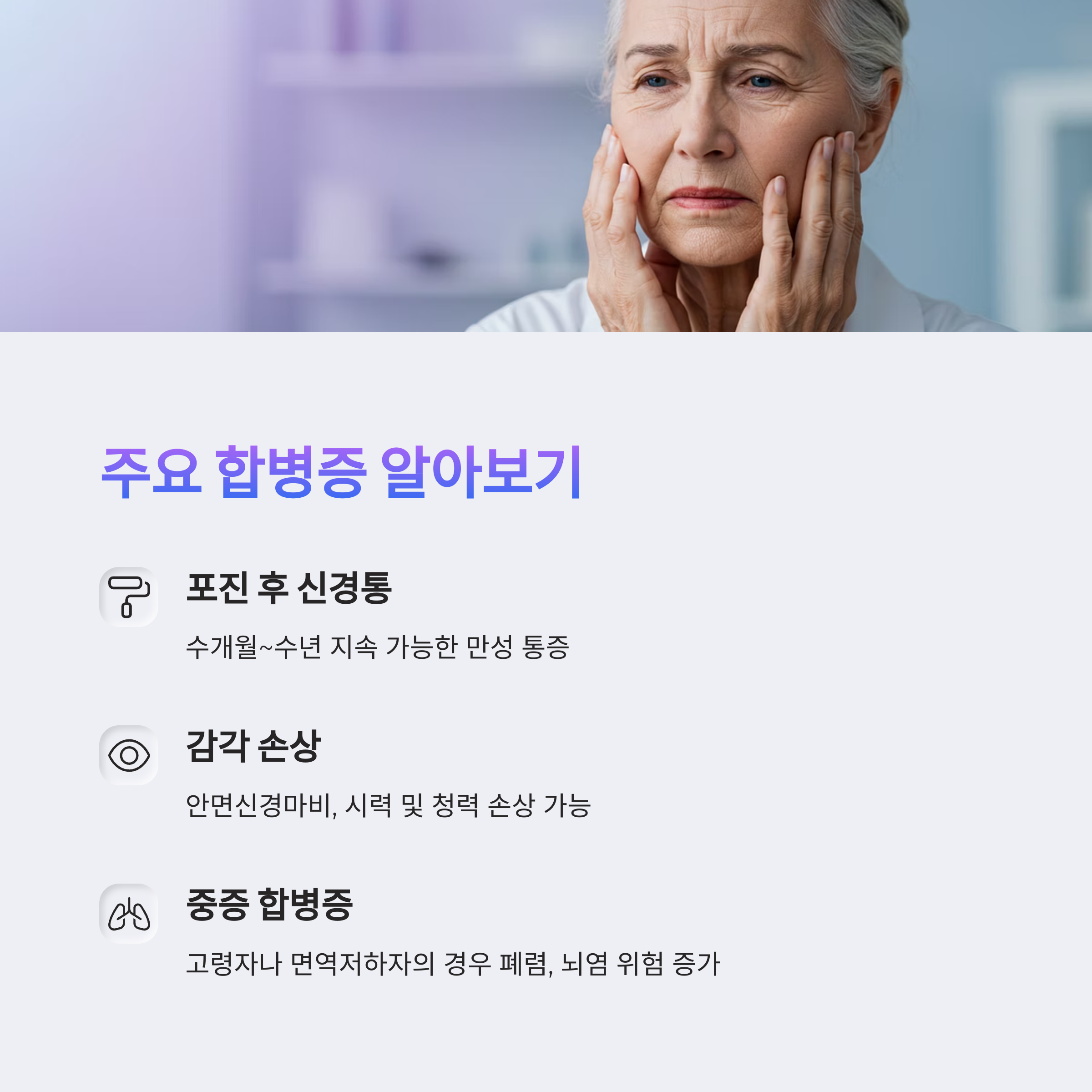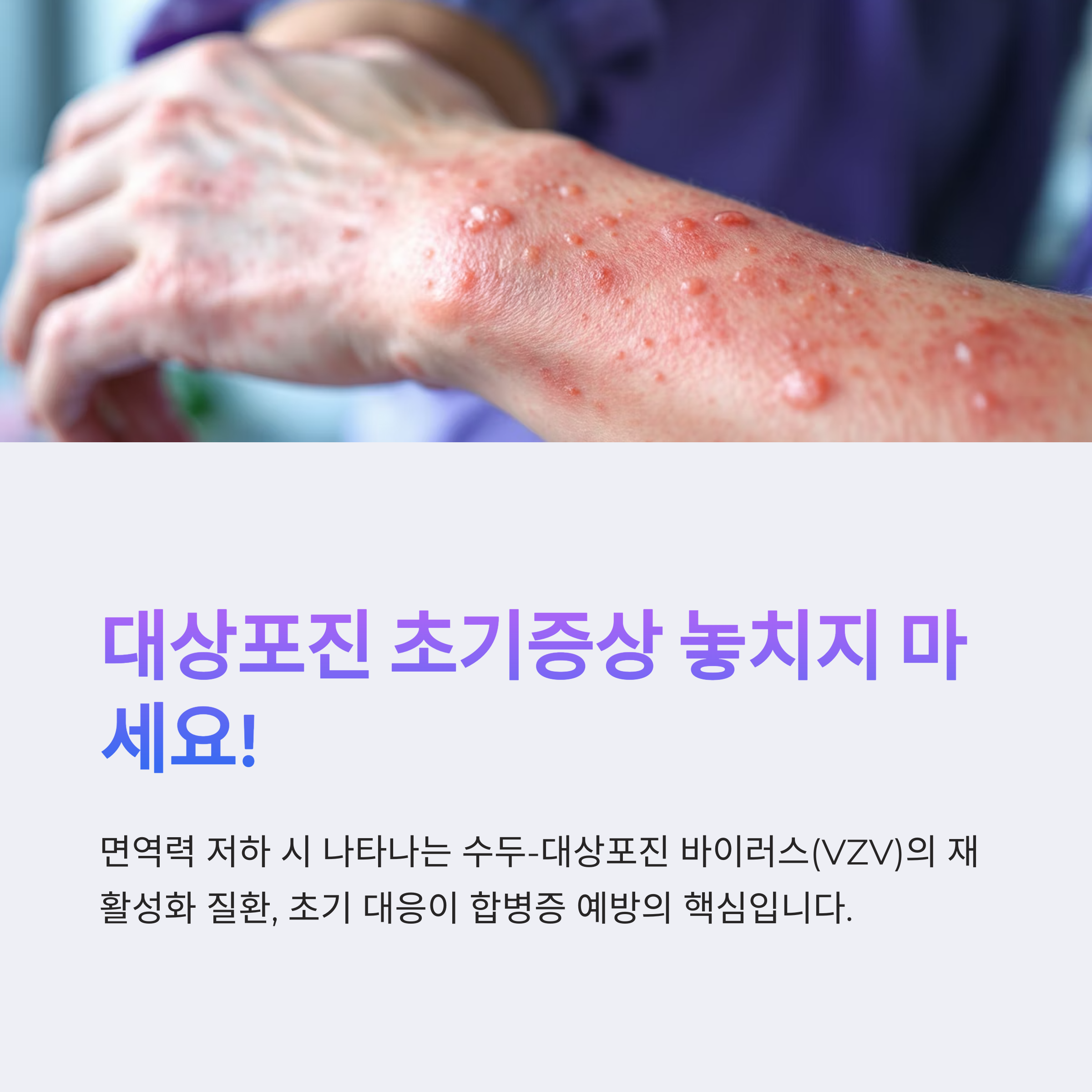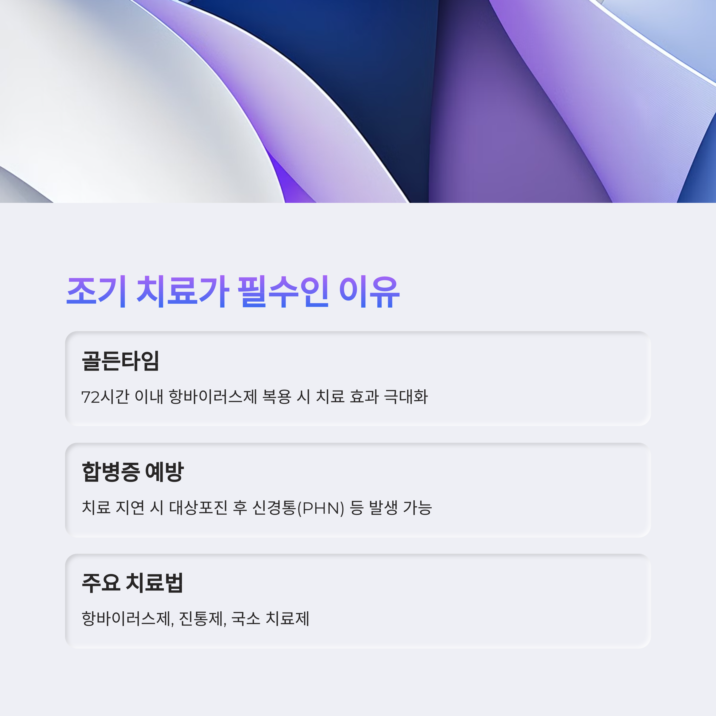 - 치료 지연 시 대상포진 후 신경통(PHN) 등 심각한 합병증 발생 가능